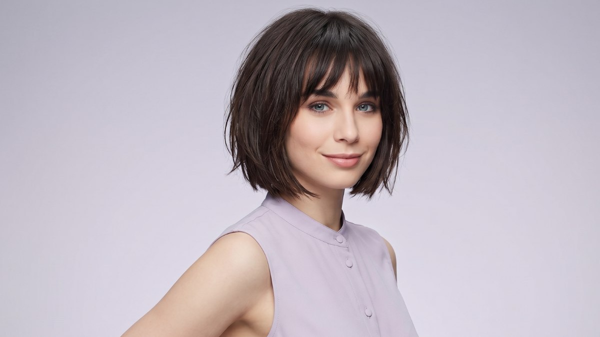 The bangs are still there, now a bit more defined against the shorter hair. They frame the face and highlight the cheekbones and eyes. The espresso color stays just as beautiful, and with less weight pulling it down, the layers have more freedom to move and breathe.
