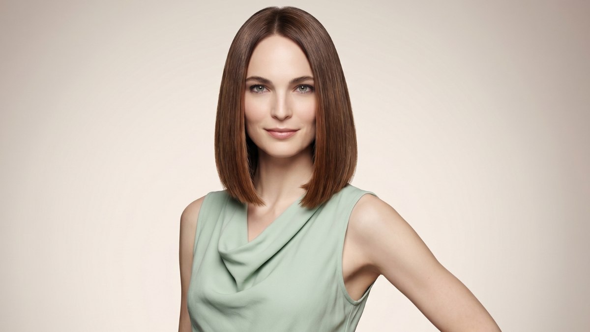 This is the kind of haircut that makes you stand a little taller. Powerful and made for spring. This long bob is built on clean lines and a glossy, smooth finish. The hair ends right at the shoulders and is cut slightly longer in the front, creating a face-flattering angle.