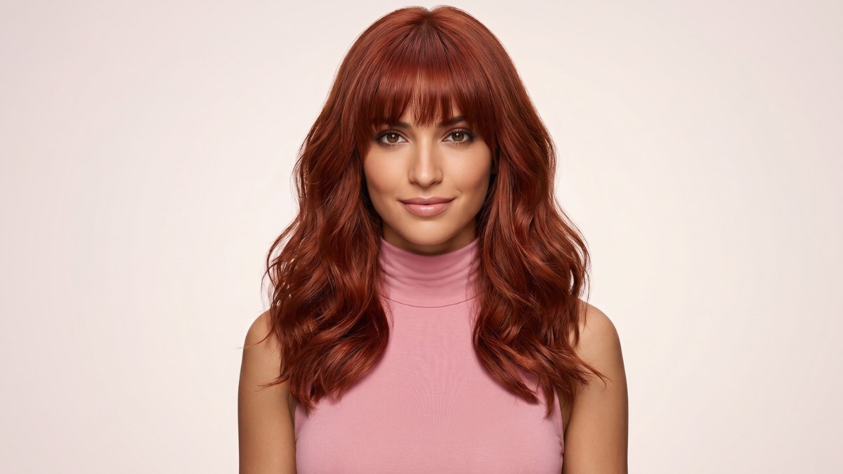 This hairstyle is for a woman who isn’t afraid to be the center of attention and wants her hair to show her inner glow. The hair color is the first thing you notice: a deep crimson that sits somewhere between auburn and true red, running from root to tip.