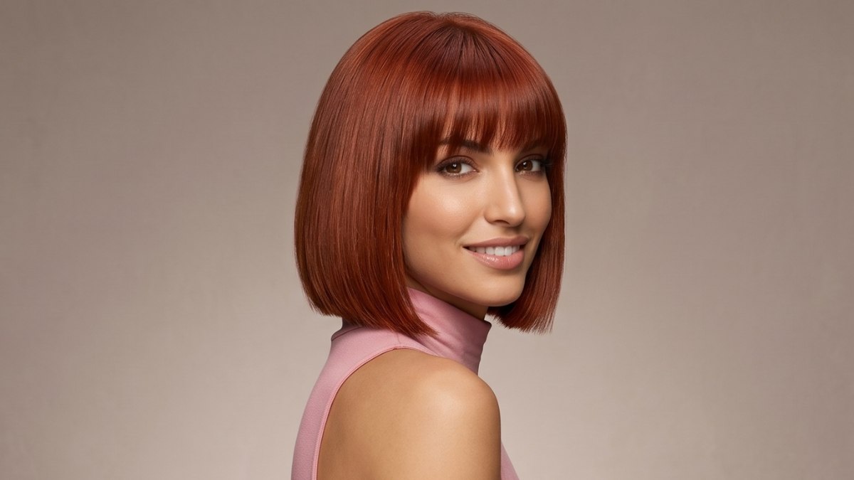 The bangs sit in perfect balance with the bob length. Together, they build a strong geometric frame: the fringe defining the forehead, the bob drawing attention to the cheekbones on either side.