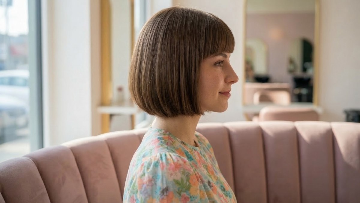 The deep chocolate hue serves as a rich canvas for this sleek cut, while the straight-across bangs are tailored to flatter and bring focus to the eyes. Polished but never rigid, the overall effect is fresh, refined, and perfectly modern.