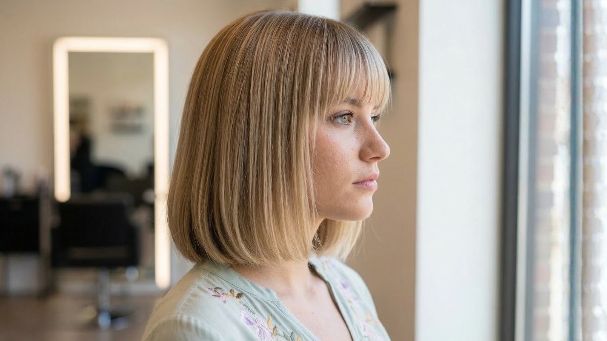 The cut itself maintains the integrity of a traditional bob, with subtle layering to soften the ends and avoid heaviness. Soft, face-framing bangs lend a youthful touch and tie the whole look together. It’s a perfect choice for women looking to add light and warmth to their style.
