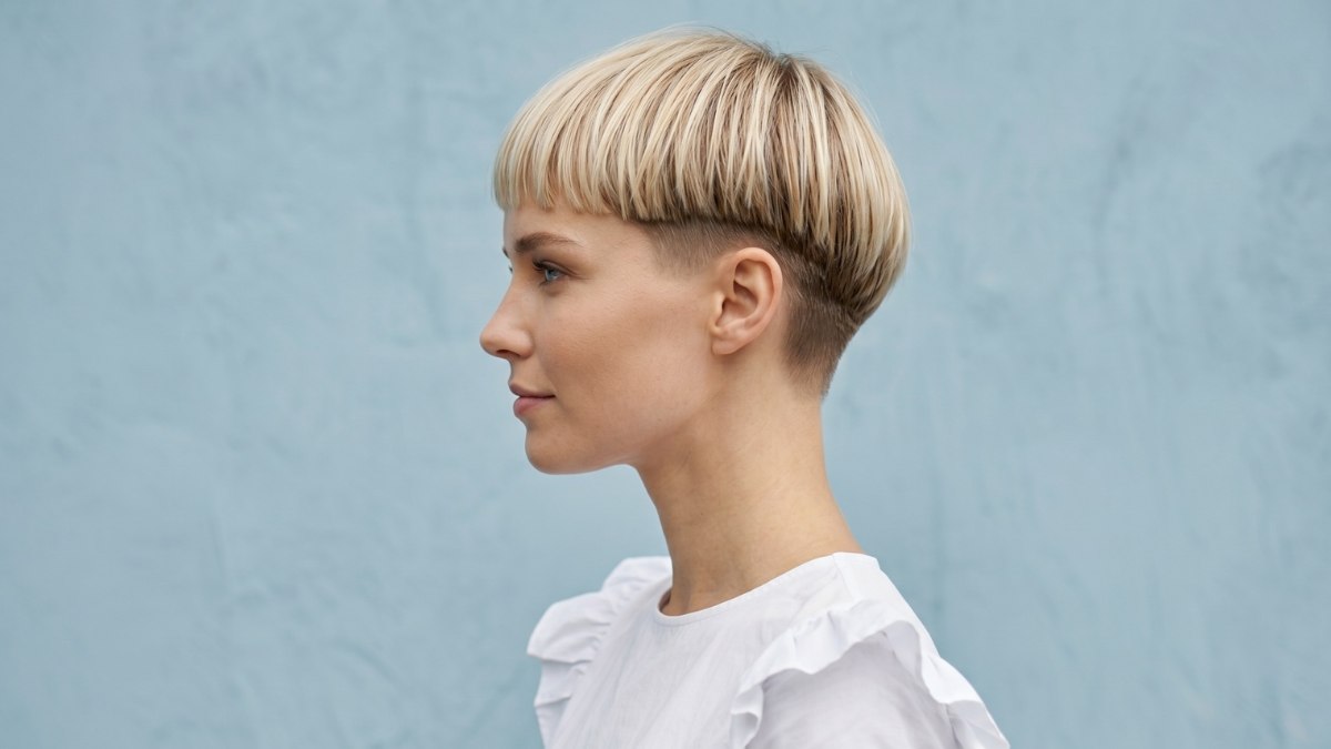 The bowl cut is back, and it has never looked more chic than this. This blonde version takes what was once considered a dated style and turns it into something completely of the moment. The cut is precise: a smooth cap of hair sits on top of the head with a perfectly even fringe across the forehead, while the sides and back are shaved very short.