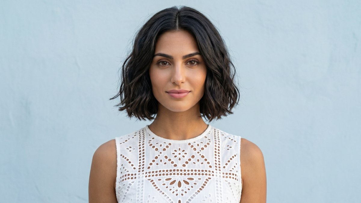 The hair is cut into a soft, rounded bob that sits well above the shoulders, with a center part and loose, natural waves that give it movement. The color is a very deep, almost blue-black brown, rich and glossy and striking against her warm complexion.