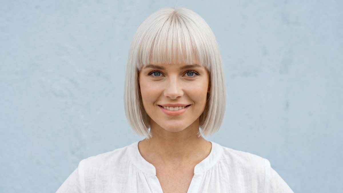 This platinum bob with a blunt fringe is a style that looks equally stunning from every angle. The hair is cut into a sharp, straight bob that falls to just below the chin, with a full fringe sitting neatly across the forehead. The color is a cool platinum blonde.