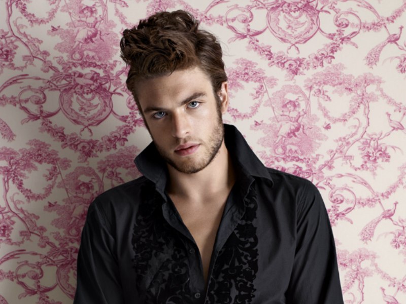 Rebellious and seductive, especially with this type of shirt, this look also offers flexibility for various styling options. His hair color is a natural dark blonde, harmonizing with his eyebrows and the interesting short beard.