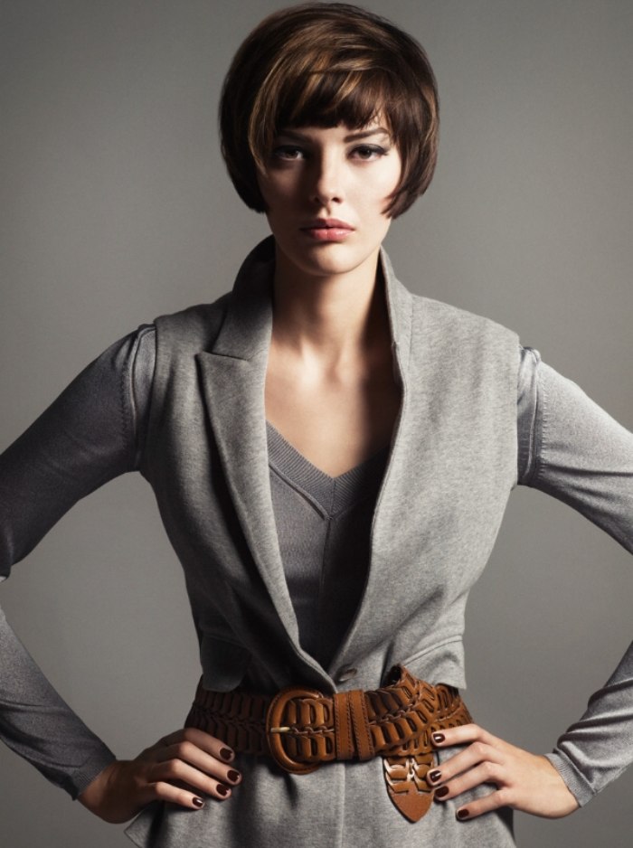 This short bob directs focus to the eyes and cheekbones with its feature-enhancing shape. The fringe is integral to the look, and here it meets an irresistible combination of caramel and dark chocolate brown hair, cut meticulously and styled in three directions: slightly diagonal with a visible straight line, two larger strands running crosswise, and long top layers smooth along the side in a rounded curve.