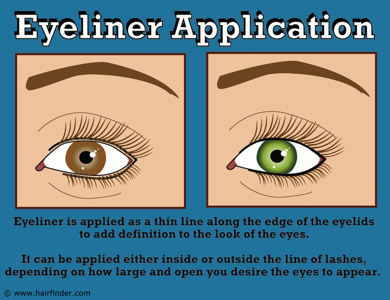 Eyeliner is meant to do as its name says. It is intended to line the eyes. It gives an outline to the sometimes bland borders created by pale eyelashes and fair skin. Generally, eyeliner is meant to be applied in a thin line just inside the rows of eyelashes. However, for those who want the eyes to appear larger, applying eyeliner along the outside edge of the lashes is preferred.