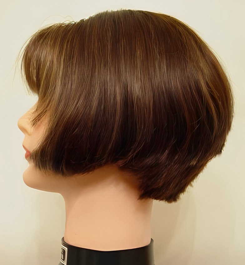 A contemporary variation of the classic bob haircut involves using an angled cutting line to add layers along the bottom edge of the haircut. This modification results in a more "fitted" appearance for the style, with a softer, rounder look.