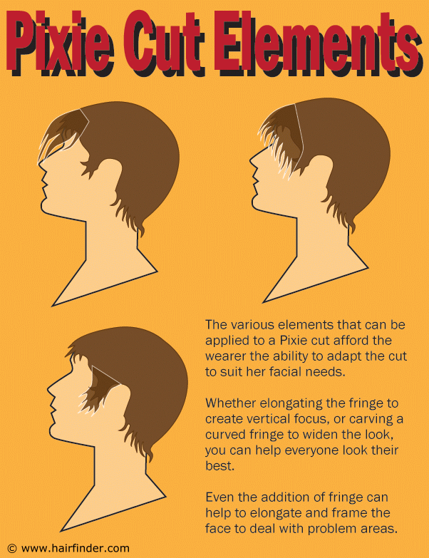 The pixie cut has a number of variations that enable it to be adapted to different facial needs. The inclusion of bangs, sideburns, and extended nape sections can help to accommodate many of the needs of problem features.
